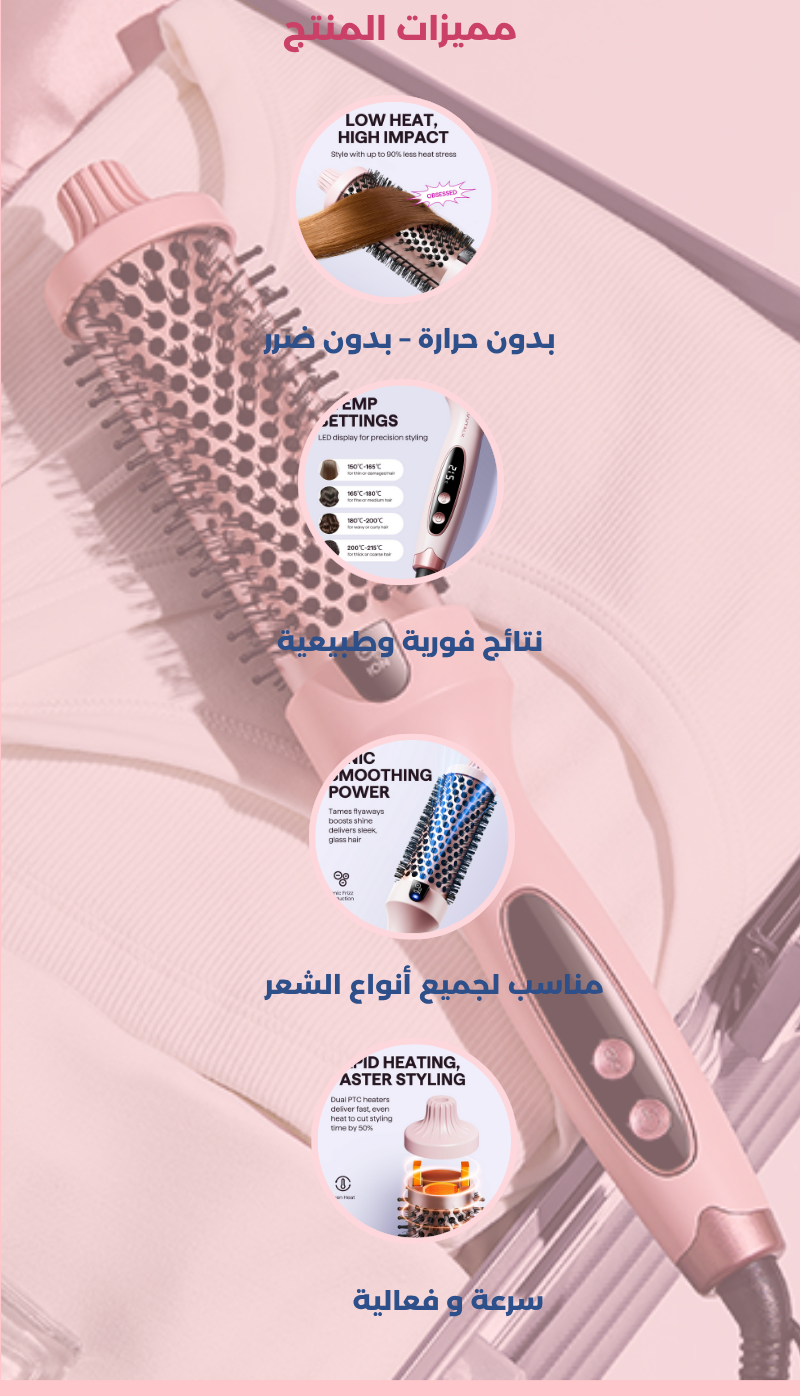 فرشاة RoseGold™ تجمع بين قوة مجفف الشعر ودقة فرشاة التصفيف لتمنحك شعرًا منسدلًا، لامعًا، ومفعمًا بالحيوية خلال دقائق فقط.